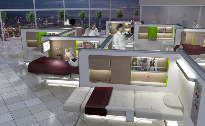 头等舱病房,用头等舱的模式来设计病房,病人不仅很舒适,而且会享受到一种人性化的尊重,PriestmanGoode 设计。