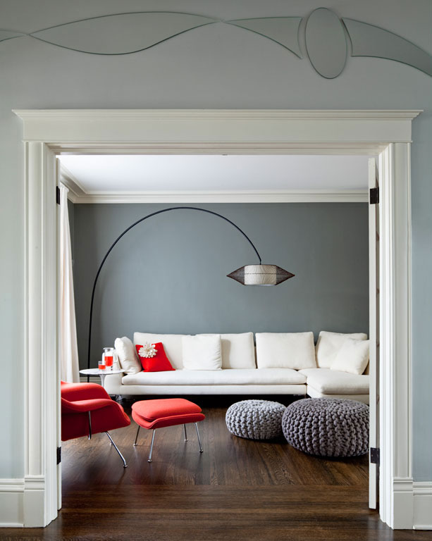 A palette of whites and cool grays creates both continuity and contrast throughout the home, particularly through our selection of wall colors, e.g. a light-gray entry that leads to a medium-gray living room and a dramatically dark-gray dining room and library. Other creative surface treatments include laser-cut mirrors, whose organic shapes dance along the entry walls, reflecting surprising snippets of the interior. The house is now fresh, bright, functional, and contemporary, while remaining true to itself.