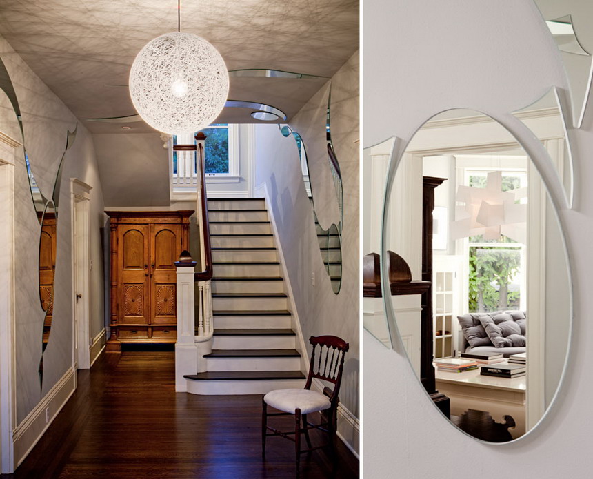 Left: Mirrored entry / Right: Reflection of the family room in the mirrored entry