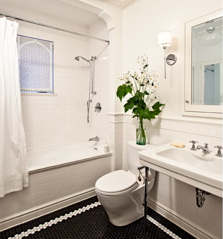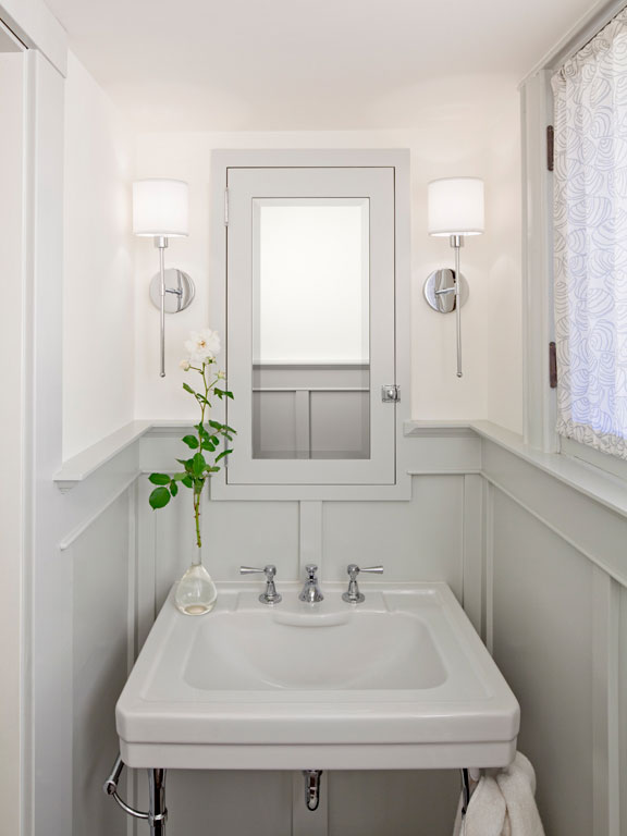 We completely remodeled the kitchen, opening it to the dining room with two-sided glass cabinets. Also on the ground level, we replaced a full bath with a compact powder room, thereby creating a back hallway and vastly improving the flow of the house. On the second level, we borrowed excess space from an existing bedroom to create a master bathroom, complete with double sinks and a generously sized shower, and designed a cabinet that beautifully conceals a washer, dryer and storage space at the top of the stairs. Finally, we transformed the formerly dim attic into a cheerful, sunny home-office and play area, freshening the walls and floors with white paint and installing four large skylights.