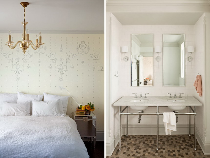 Left: Master bedroom with walls hand-painted by Jessica / Right: Master bath